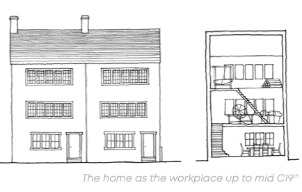 The consideration of this subject matter is likely to have come about due to the way in which the design of dwellings had been developing at the time. The typical pattern applied to the design of our housing had occurred following changes within English society from the mid-eighteenth century. Prior to this, in pre-industrial Britain, the urban house contained a mixture of people and activities, generating a co-existence of domestic lives over-lapping with private work and recreation domains. A dislike for this style of living led to an increasing preference for a more demarcated private side to family life. And a stronger differentiation of function, and allocation of separate rooms for each and every purpose began to evolve itself into the design of our houses. This might have occurred partly due to the increasing compartmented organisation of industrialised employment, which started to be reflected in living trends.
