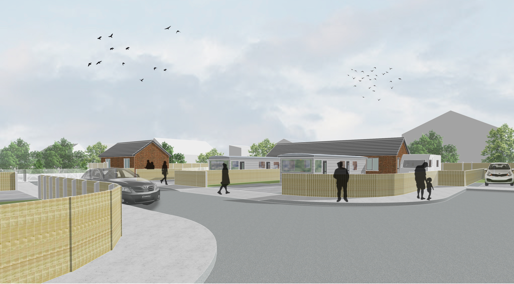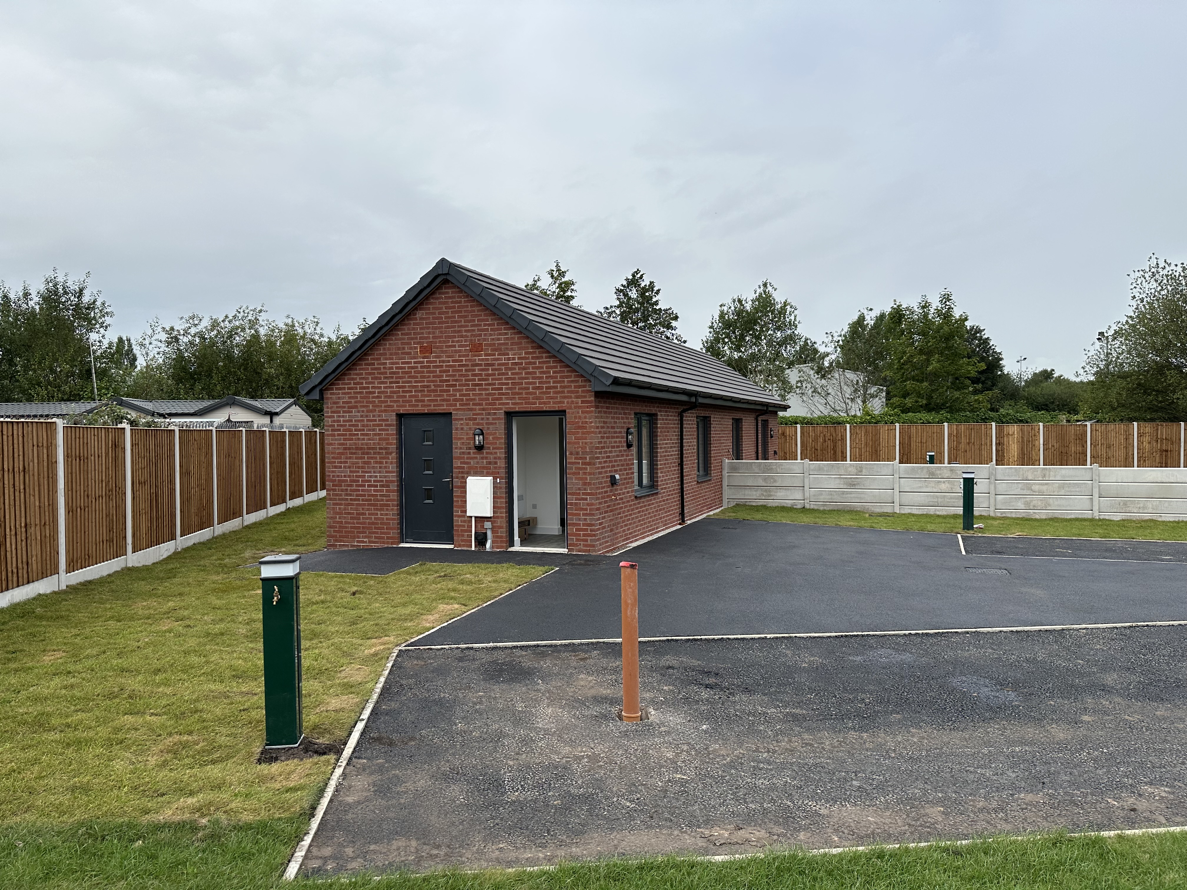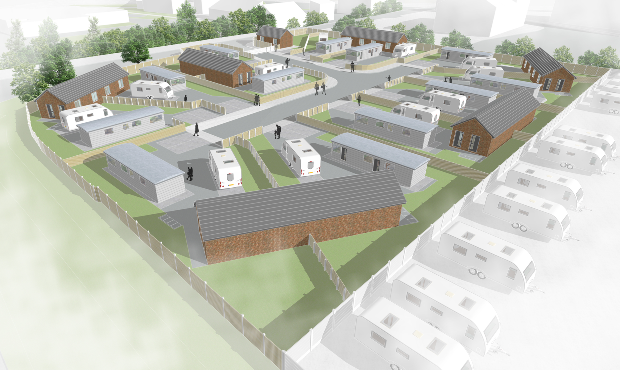 In addition to the amenity building, each pitch provides space for a small static, a trailer/caravan and two car parking spaces with electric vehicle charging. External amenity space is also provided for each family within their pitch, and a communal external play space is located adjacent to the office building.