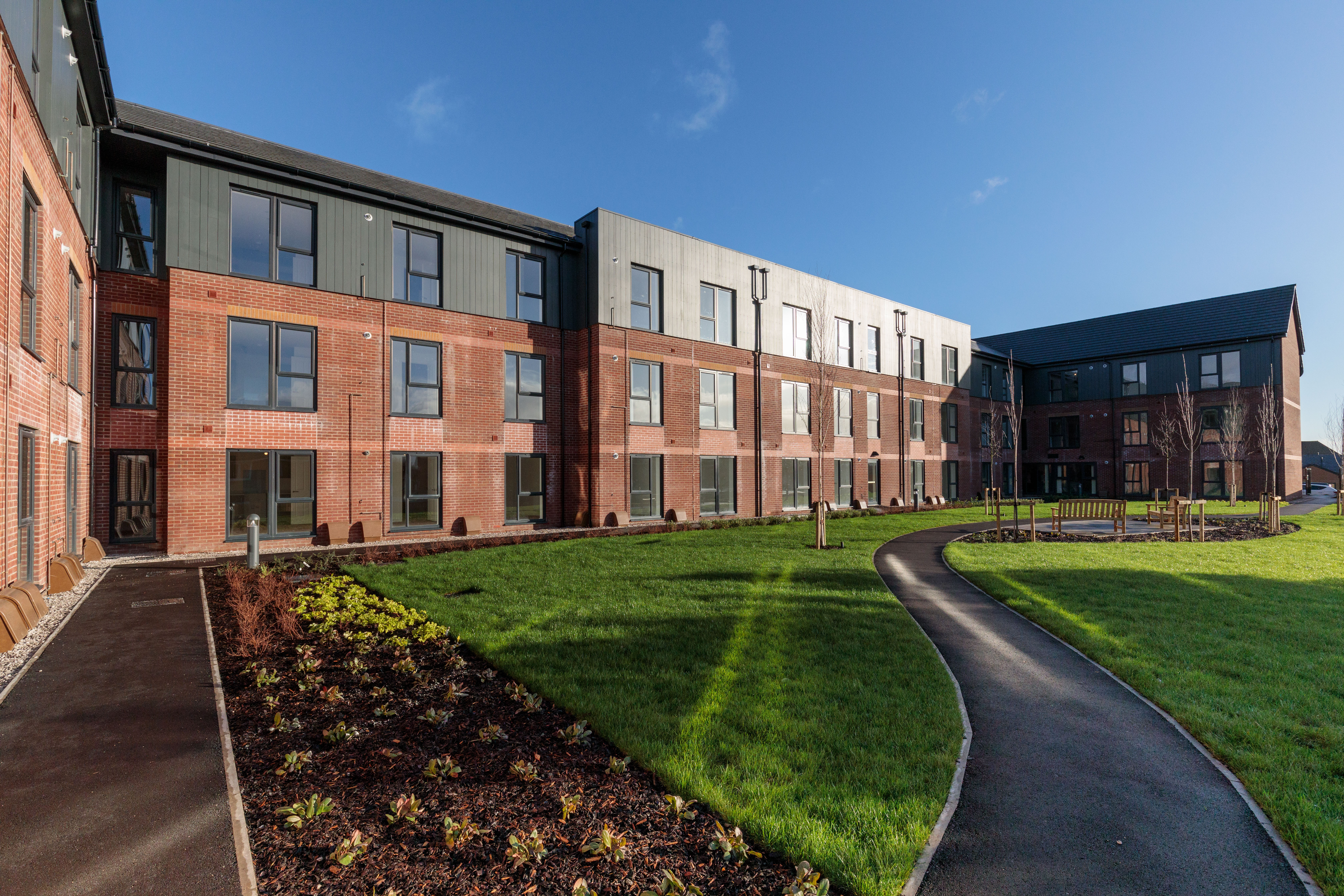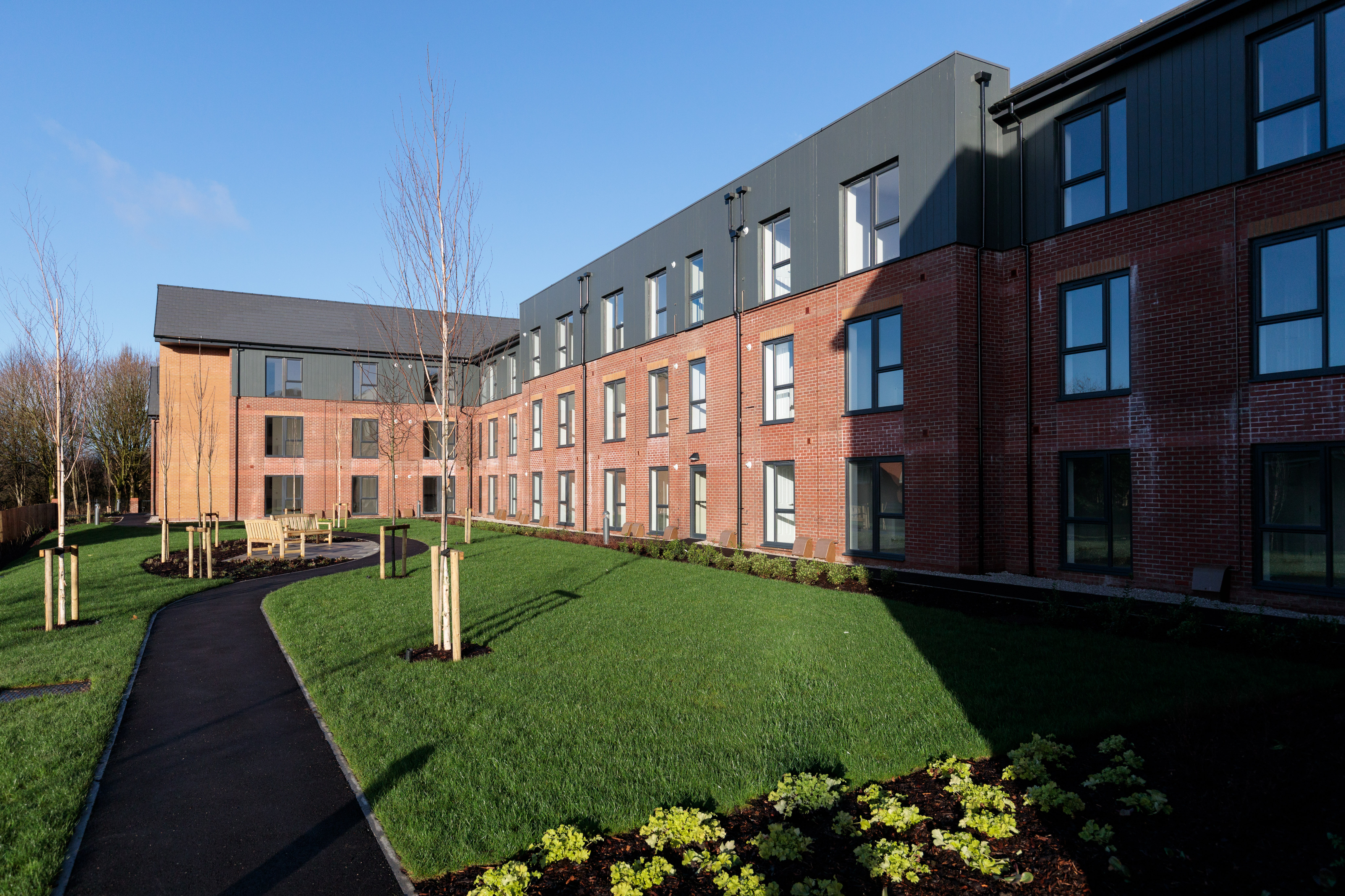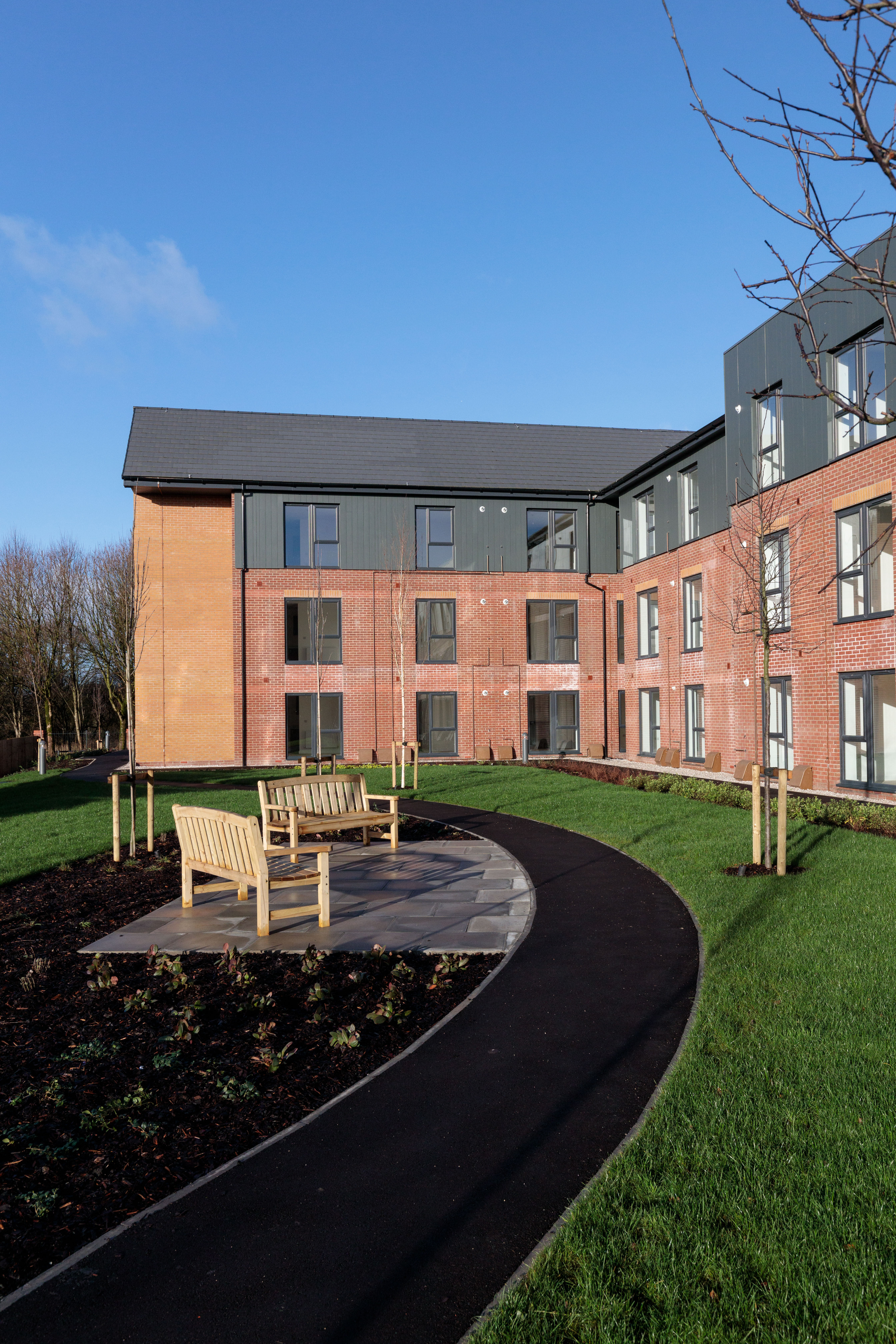 This retirement living development comprises 9no. Bungalows and 78no. flats with associated landscaping. Situated on land of former Firsway Garage on Plank Lane, the site is located within an already established residential neighbourhood and close to existing amenities. The carefully designed apartment block has effectively dual frontage, with main pedestrian entrance served directly off Plank Lane and an alternative entrance via its private car park at ‘rear’, located off Mitchell Street.