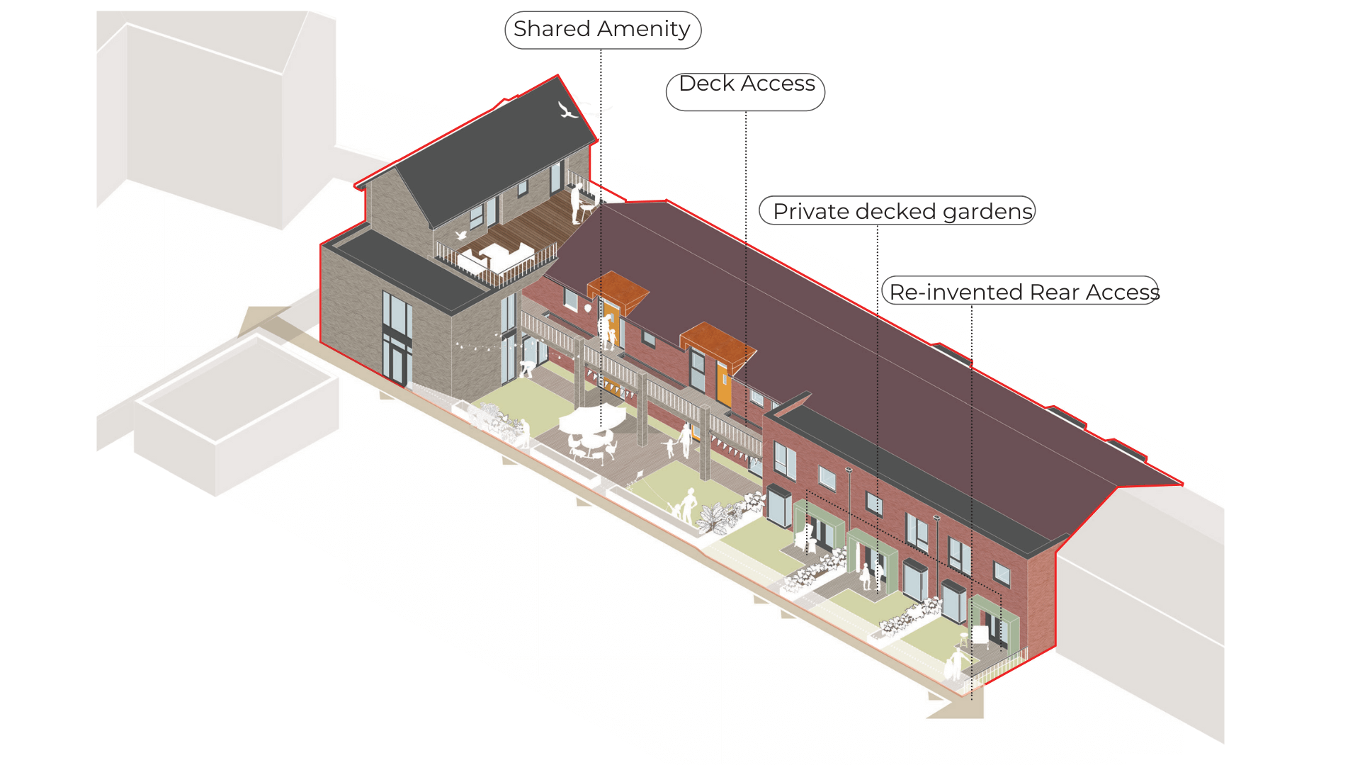 Liverpool’s terraced streets have long provided an opportunity for fostering a strong sense of community through daily interactions among residents. These encounters: walking past neighbours’ homes or using communal facilities, create opportunity for conversation, foster friendships and help to build strong communities. Our design embraces these interactions, encouraging them as essential aspects of the living experience. Deck access, communal gardens and a communal hub serve to facilitate this.