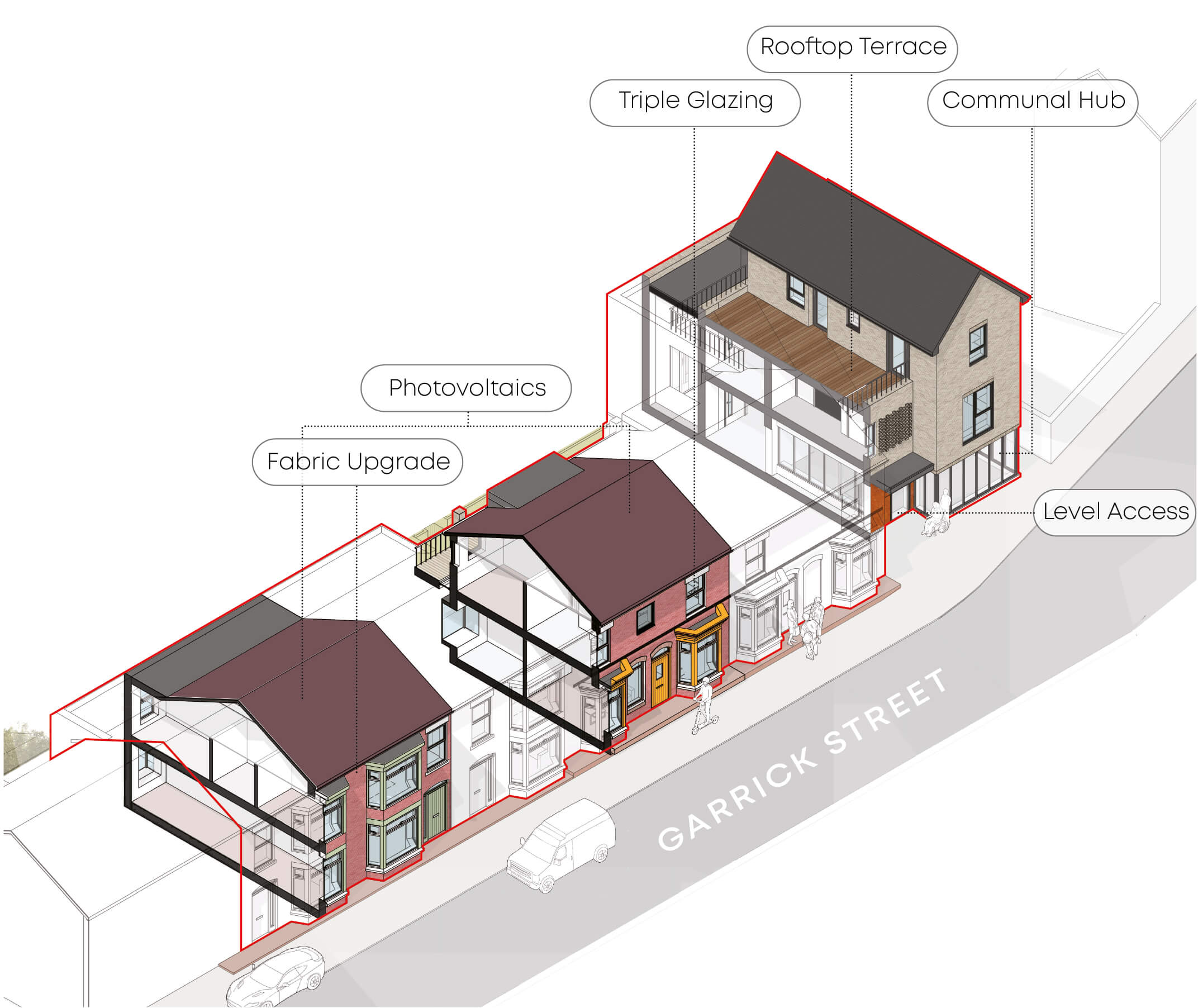 Properties benefit from improved enveloping performance, triple-glazed windows, and renewable energy sources. The front streetscape is retained, and the rear of the terrace given a new lease of life.